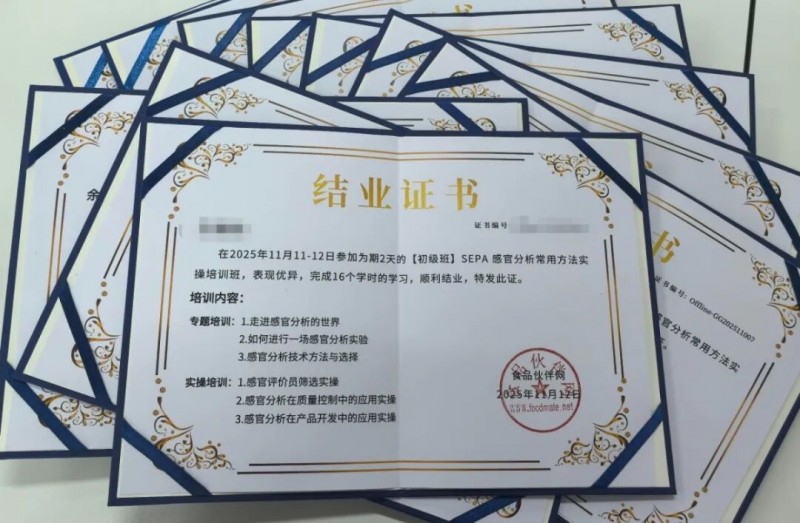 超多落地且實用的感官內(nèi)容安排,學員們認真學習并記錄課上內(nèi)容,收獲頗豐。在培訓的最后,食品伙伴網(wǎng)感官服務(wù)事業(yè)部給每一位學員都頒發(fā)了結(jié)業(yè)證書!