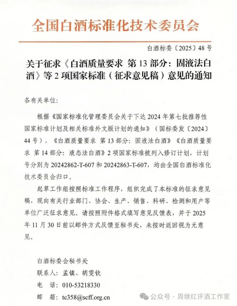全國白酒標準化技術委員會發(fā)布的關于《白酒質量要求第13部分:固液法白酒》、《白酒質量要求 第14部分:液態(tài)法白酒》和《白酒感官品評術語》3項國家標準(征求意見稿)征求意見還有一周就結束了,有反饋意見的單位和用戶抓緊填寫意見反饋表,并于2025年11月30日前以郵件方式反饋至秘書處。