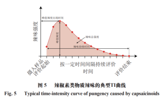時(shí)間-強(qiáng)度(time-intensity,TI)法:是一種用于評(píng)價(jià)樣品辣味隨時(shí)間變化的感官評(píng)價(jià)手段,是經(jīng)典感官評(píng)分方法的延伸,這種方法常利用不同濃度的辣椒素標(biāo)準(zhǔn)品 使參評(píng)人員建立相對(duì)統(tǒng)一的感官評(píng)價(jià)標(biāo)準(zhǔn),并要求品評(píng)員在攝入樣品后的一段時(shí)間內(nèi)持續(xù)地對(duì)辣味的強(qiáng)弱進(jìn)行打分。