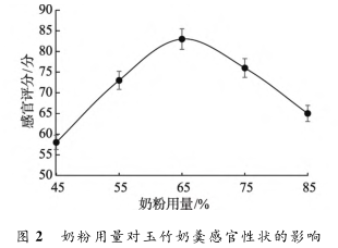 從圖2可以看出,當奶粉用量對玉竹奶羹感官評分有一定影響,分值呈現先增大后減小的趨勢。奶粉用量較低時,奶羮顏色較深,品嘗不出奶香味,故而感官評分較低;