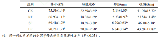 從表3中可看出,與對照組(CK)相比,經凍結處理后油炸牡蠣樣品的持水性均顯著下降(P<0.05),其中RF的下降幅度較大。LF和SF的持水性高于RF(P<0.05),表明凍結速率較快的LF和SF相對于傳統凍結方式能夠一定程度上能維持油炸牡蠣樣品的持水性,因此,凍結方式對油炸牡蠣冷凍制品的持水性有較大的影響,RF和LF凍結可顯著減緩牡蠣水分的損失。