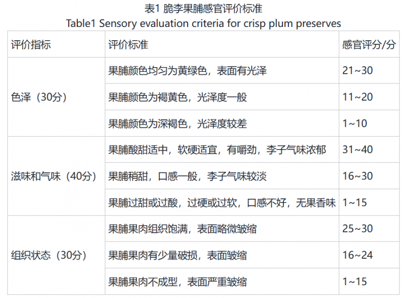 參照李本姣等和GB 14884-2016《食品安全國家標準 蜜餞》中的感官標準設計感官評定表,從色澤、滋味和氣味、組織狀態三個方面來評價脆李果脯的食用品質,感官評價表如表1所示。