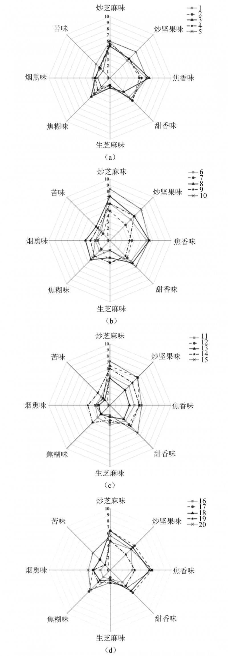 小磨芝麻香油的獨特風味源自芝麻焙炒過程中發生的美拉德反應、焦糖化反應及脂肪氧化反應等變化。由圖10可知:20種市售小磨芝麻香油均具有芝麻油的特征香氣,但其感官屬性存在一定的差異。其中,10號和15號樣品的炒芝麻味、炒堅果味、焦香味和甜香味均明顯高于其他樣品,這些主要來源干加工過程中的美拉德反應,同時這2個樣品色澤呈琥珀色。3-MCPDE和GE含量較低,說明其焙炒工藝控制得當;8號和14號樣品的焦糊味高于其他樣品,可能是因為焙炒過度,導致美拉德和焦糖化反應加劇,形成了更多的苦味和焦糊味物質。此外,13號樣品的芝麻油風味弱于其他樣品,而且還有輕微酸敗味,結合其色澤較淺和其中檢測到的細辛素,推測其可能混入了浸出精煉的芝麻油。