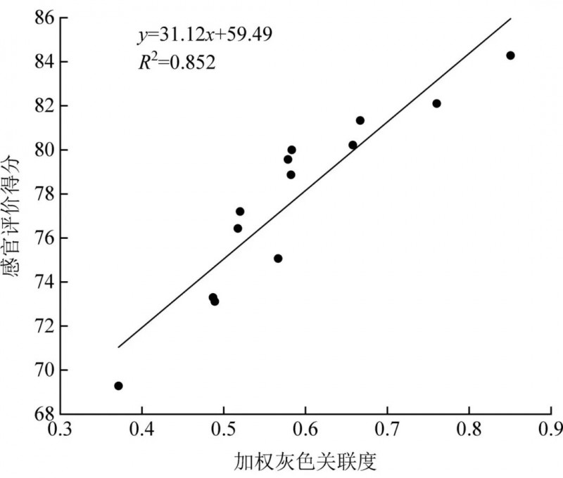 結果驗證利用回歸分析對感官得分和評價模型綜合得分進行擬合,得到線性方程y=31.12x+59.49(R2-0.852)(圖6)。表明以油脂質量分數、a*值、咀嚼性、維生素C含量和內聚性建立的品質綜合評價模型能夠準確評價真空油炸薯條品質優劣。