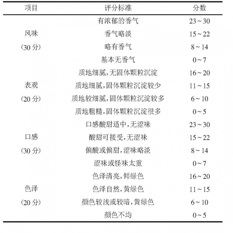 感官評價根據國標《固體飲料》(GB/T 29602—2013)進行制定,隨機選10位專業相關人員進行感官評估,設置有4個感官指標,滿分100分,評分標準見表3。