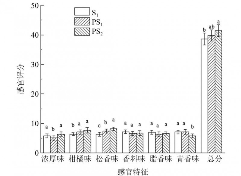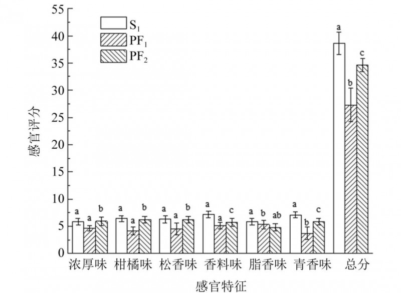 牛油,廣漢市邁德樂食品有限公司;甘肅隴南武都花椒(水分<11 %)、白酒(乙醇體積分數53 %),市售;甲醇,色譜純;鄰二氯苯、正構烷烴標準品,上海阿拉丁生化科技股份有限公司;羥基-a-山椒素、羥基-β-山椒素、羥基-γ-山椒素標準品(純度>98 %),中國成都麥森科技股份有限公司。02感官評價方法感官評價方法參考文獻的方法稍作修改。將50 mL炸制花椒后的牛油倒入洗凈的燒杯中,由10名專業人員進行感官評價。根據風味剖面法對樣品進行分析描述,確定樣品的6個呈香屬性分別為濃厚味、柑橘味、松香味、香料味、脂香味及青香味。對不同的氣味強度由弱到強從0~9進行賦分(濃郁7~9、適中4~6、較弱0~3)。對所有樣品進行3次感官評價,結果取平均值,比較不同樣品之間的香氣特征。